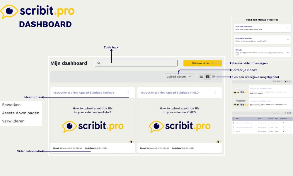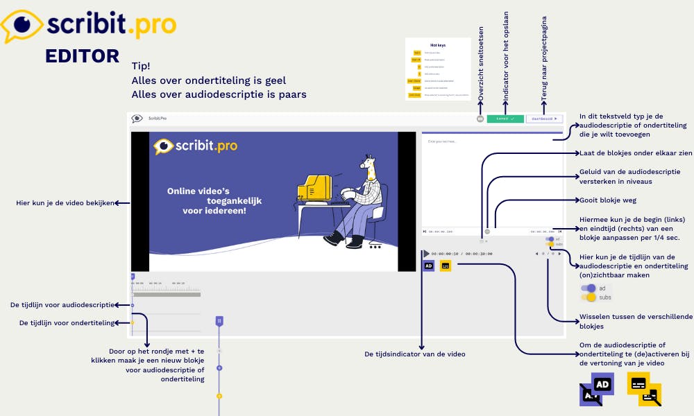 Beginnen met videotoegankelijkheid hoeft niet moeilijk te zijn. Met Scribit.Pro maak je zelf je video toegankelijk door ondertiteling, audiodescriptie en een transcript toe te voegen. Maar hoe doe je dit? Op deze pagina vind je een stapsgewijze handleiding en gedetailleerde overzichten van het dashboard, de projectpagina en de editor. Leer hoe je eenvoudig toegankelijke video's maakt en ontdek de functionaliteiten van elke knop, zodat je moeiteloos kunt beginnen met het toegankelijk maken van jouw content.