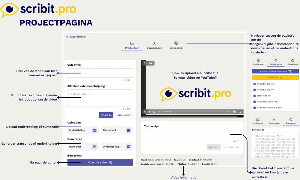 - Op de projectpagina kun je (indien aanwezig) de ondertiteling uploaden.